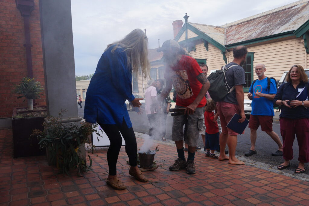 Outside the Castlemaine Town Hall crowds begin to gather. I walk towards the entrance, each footfall in rhythm with the thrum of a didgeridoo, a sound I always imagine as earth’s voice, or one of them at least; a kind of reverberation from what Martin Shaw describes as this ‘huge dreaming animal’ we call earth. Next to the didge player, Uncle Rick places eucalypt and other indigenous leaves, one by one, into a simple iron hearth, transmuting flame into smoke. He gestures for us to participate; he invites our bodies, our spirits, to be touched by smoke, to be cleansed; he calls us to get smoke under the soles of our feet, those sites of learning; the soles of our feet that connect us to this earth.
